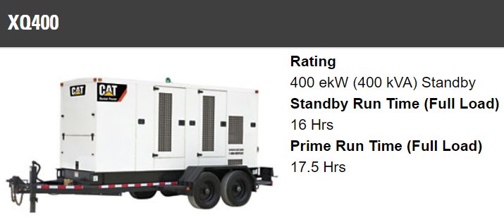 Team 1 contacted Caterpillar who “did all the research and determined what we needed.” Team 1 chose the mobile XQ400 kW generator. Zblewski said, “What we have set up is that when we determine we have a need, we call Caterpillar, and they’ll have a generator here within a short amount of time – generally, it’ll be about four hours, at the most, twelve hours.”