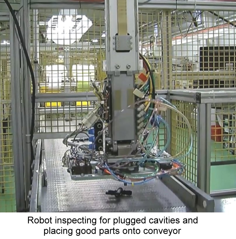 Parts produced in both Zones 3 and 4 tend to be larger and require more Operator contribution. The parts are placed via a rectilinear robot onto a conveyor. The conveyor then moves the parts to the Production Operator who may have a secondary operation to perform, such as a small inspection or layer packing. The conveyors in these zones are capable of running in either direction to accommodate the Production Operator’s work load for that day’s shift, eliminating extra movement by the Operator.