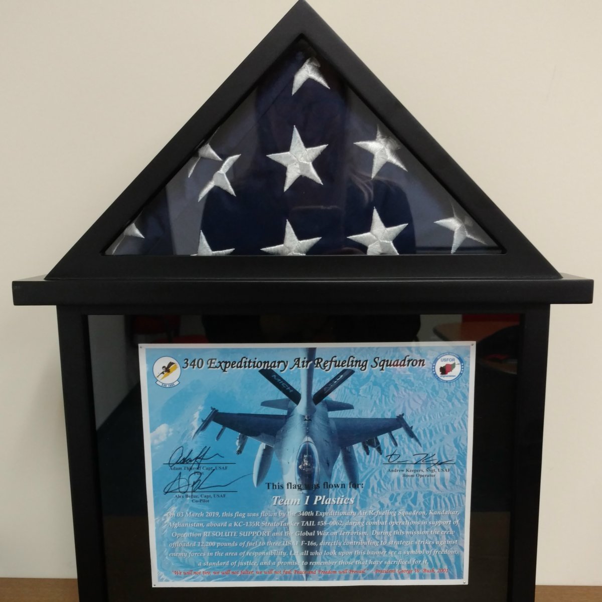 In a brief ceremony, Team 1 Plastics was presented with a commemorative flag and certificate by Staff Sergeant Geoffrey Martin in appreciation of the support that he received through Red Shirt Fridays while serving in Afghanistan this past winter.