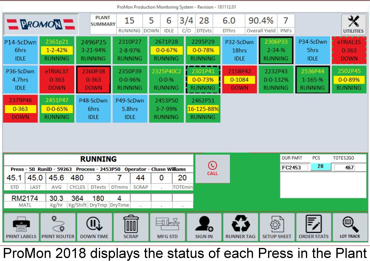 Team 1 Plastics, a plastic injection molding company for the mobility industry, recently completed a major overhaul to its proprietary production monitoring system, ProMon. Developed originally in 2006, the paperless production and quality system combines production information tracking, electronic document control and distribution, scrap recording, lot control, and other key functions at a central control panel at each injection molding machine. The upgrade, named ProMon 2018, involved both hardware and software.