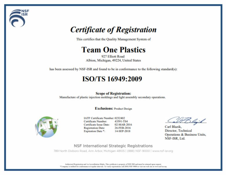 Team 1 has been certified to the ISO/TS 16949:2009 standard since 2013. Dave Sanford, Quality Manager for Team 1 Plastics, said, “Successfully passing our most recent three-day ISO/TS 16949:2009 audit demonstrates our ability to continue to grow globally. This certificate also proves to our customers that we are committed to continuous improvement and customer satisfaction.”