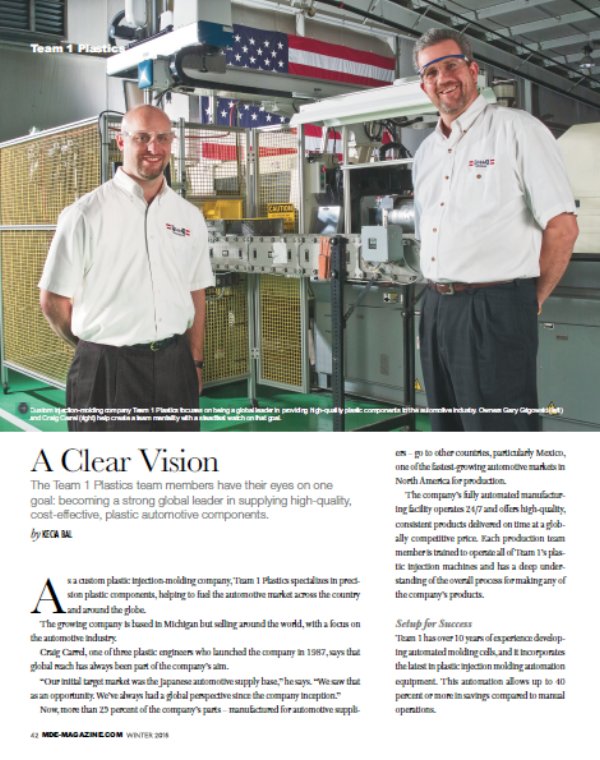 Manufacturing & Distribution Executive (MDE) magazine recently featured Team 1 Plastics as one of the cover stories in its Winter 2016 edition. The article, entitled “A Clear Vision,” discussed Team 1’s focus on “being a global leader in providing high-quality plastic components to the automotive industry.”