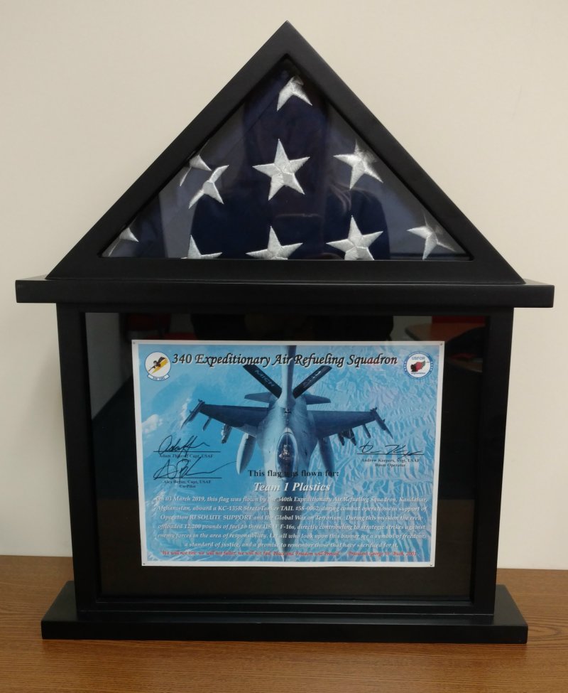 SSgt Martin is an Aircrew Flight Equipment (AFE) Technician in the 171st Air Refueling Squadron Unit of the United States Air Force, based at Selfridge Air National Guard Base. He shared the pictures with his unit and told them about the support he was receiving from his friend, Craig Clem, and Craig’s fellow Team Members. Martin said that he wanted to do something to show his appreciation for their support. They decided that they would present Team 1 Plastics with a United States flag that was flown during one of the squadron’s missions.