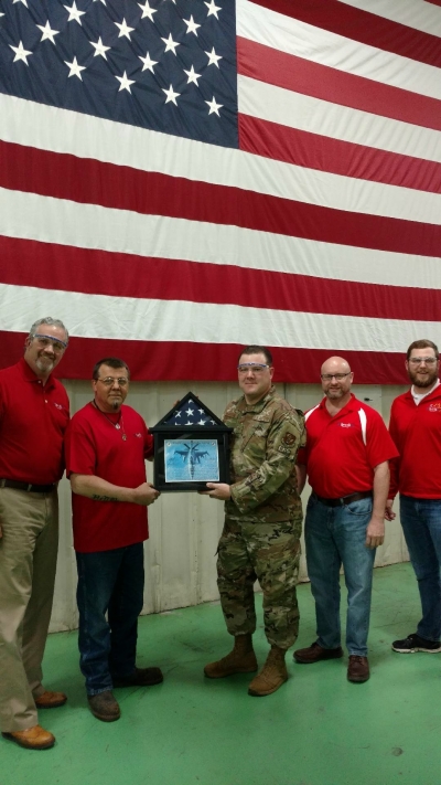 In a brief ceremony on Monday, May 13, 2019, Team 1 Plastics was presented with a commemorative flag and certificate by Staff Sergeant Geoffrey Martin in appreciation of the support that he received through Red Shirt Fridays while serving in Afghanistan this past winter.