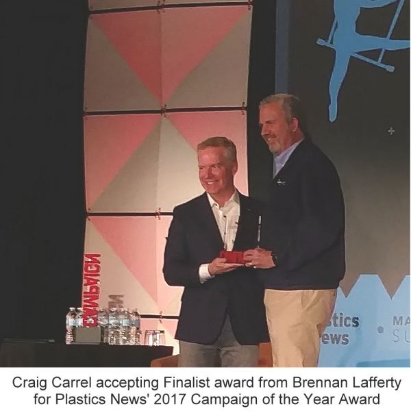 One of the Summit’s annual events is the Campaign of the Year award presentation and Panel Discussion. Team 1 Plastics’ 30th Anniversary marketing campaign was selected as a finalist for the 2017 Campaign of the Year. Carrel represented Team 1 Plastics on the Discussion Panel which consisted of a representative from each of the four finalists’ companies. In accepting the award, Carrel said, “Thank you for the award. It is an honor to be recognized by Plastics News and to share the stage with all the finalists!”