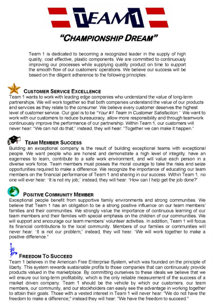 At Team 1 Plastics, the company’s Championship Dream serves as its guiding philosophy—similar to a mission or vision statement—but it goes far beyond words on paper. It’s the foundation for how Team 1 operates every day, shaping decisions, relationships, and community involvement. The Championship Dream is built on four key tenets: Customer Service Excellence, Team Member Success, Freedom to Succeed, and Being a Positive Community Member. Each represents a vital piece of what makes Team 1 Plastics a company dedicated not only to excellence in manufacturing but also to the well-being of its people and community.
