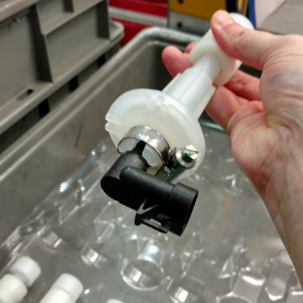 It’s very difficult to expect someone to do something perfect 10,000 times a month, but the four assembly machines used by Team 1: Grease Machine, Knob Machine, Hot Plate Welding Machine, and Float Stalk Machine, have safeguards to detect operator errors. For example, an operator must insert a spring and attach felt to a plastic case for a product that Team 1 assembles. The tool used by the operator will detect whether the part has these items and will not allow the Grease Machine to cycle if either part is missing.